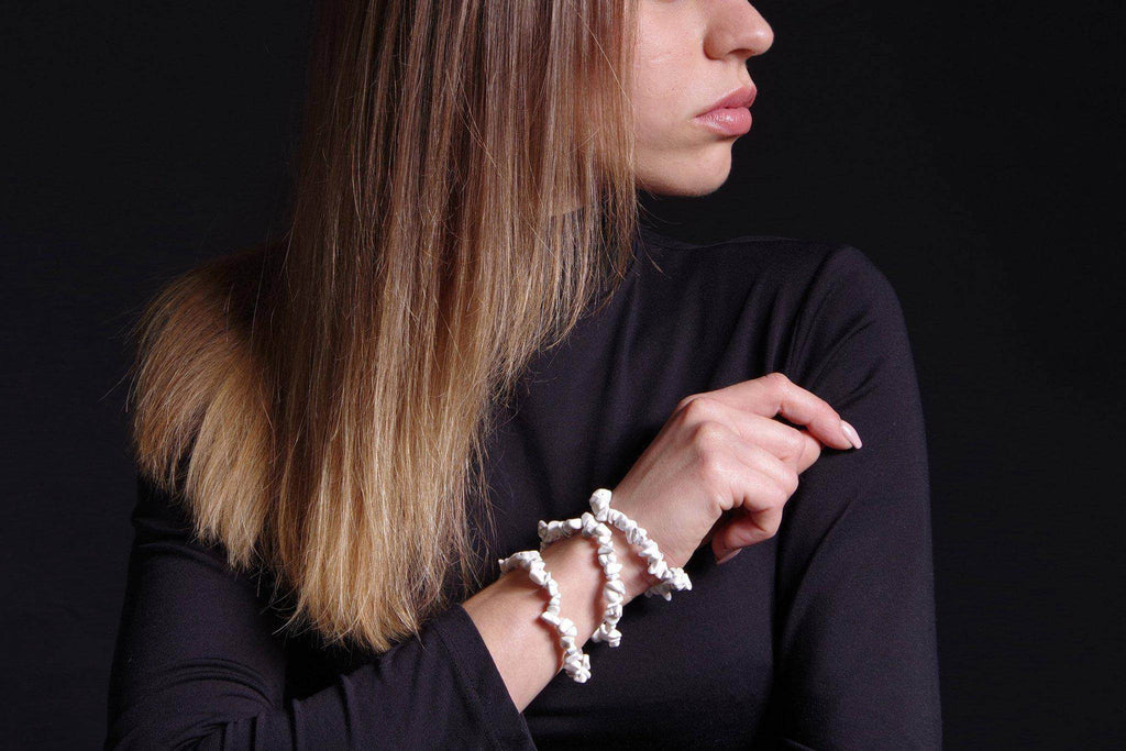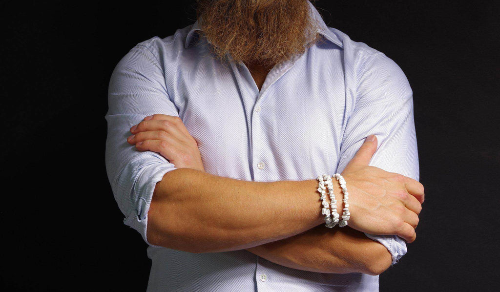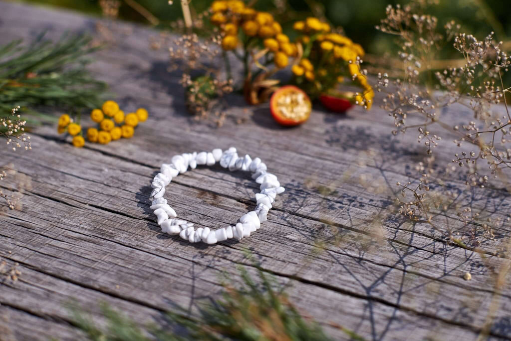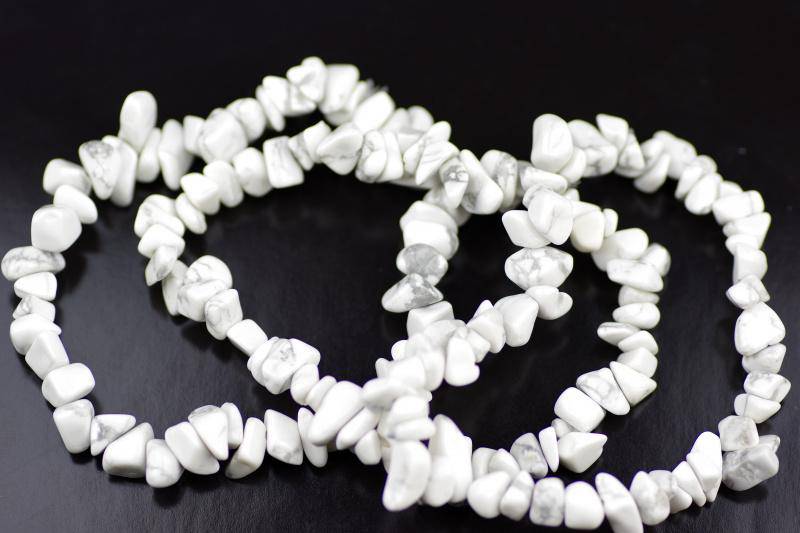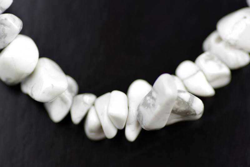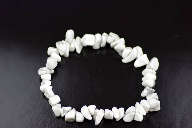 يتكون كل سوار من شظايا حجر هاوليت خام، مُشكّلة طبيعيًا، بألوان بيضاء ناعمة، مُرصّعة بعروق رمادية أو سوداء مميزة. شكلها العضوي وتنوعها يمنحان كل سوار مظهرًا فريدًا من نوعه، أشبه بالفسيفساء. - 🔄 قابل للتعديل &تصميم متين:&