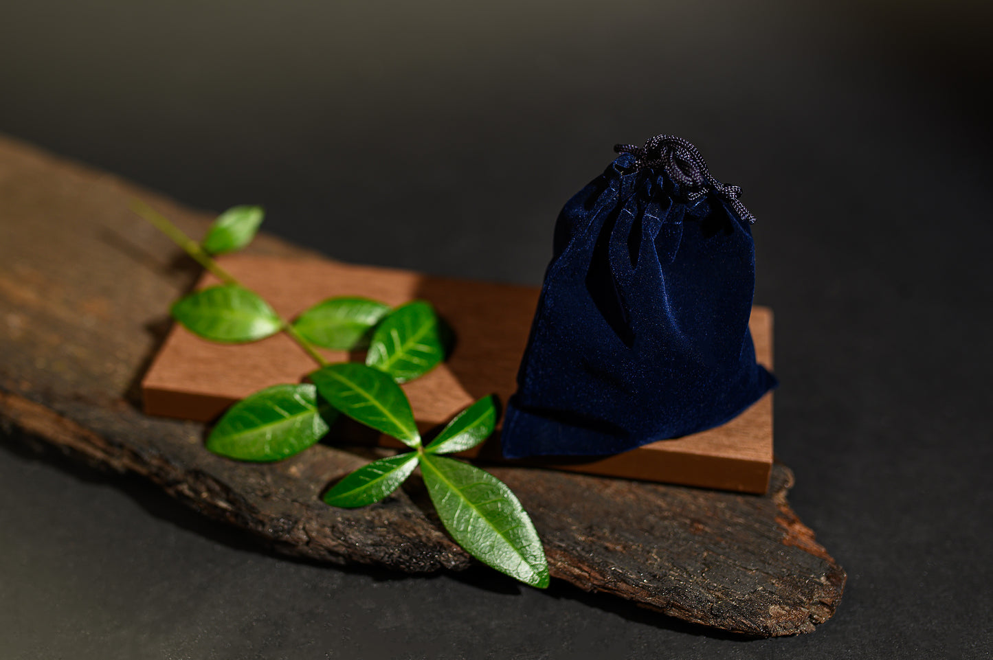 - Pussi: Syvänsininen samettinen kiristysnyörillinen laukku