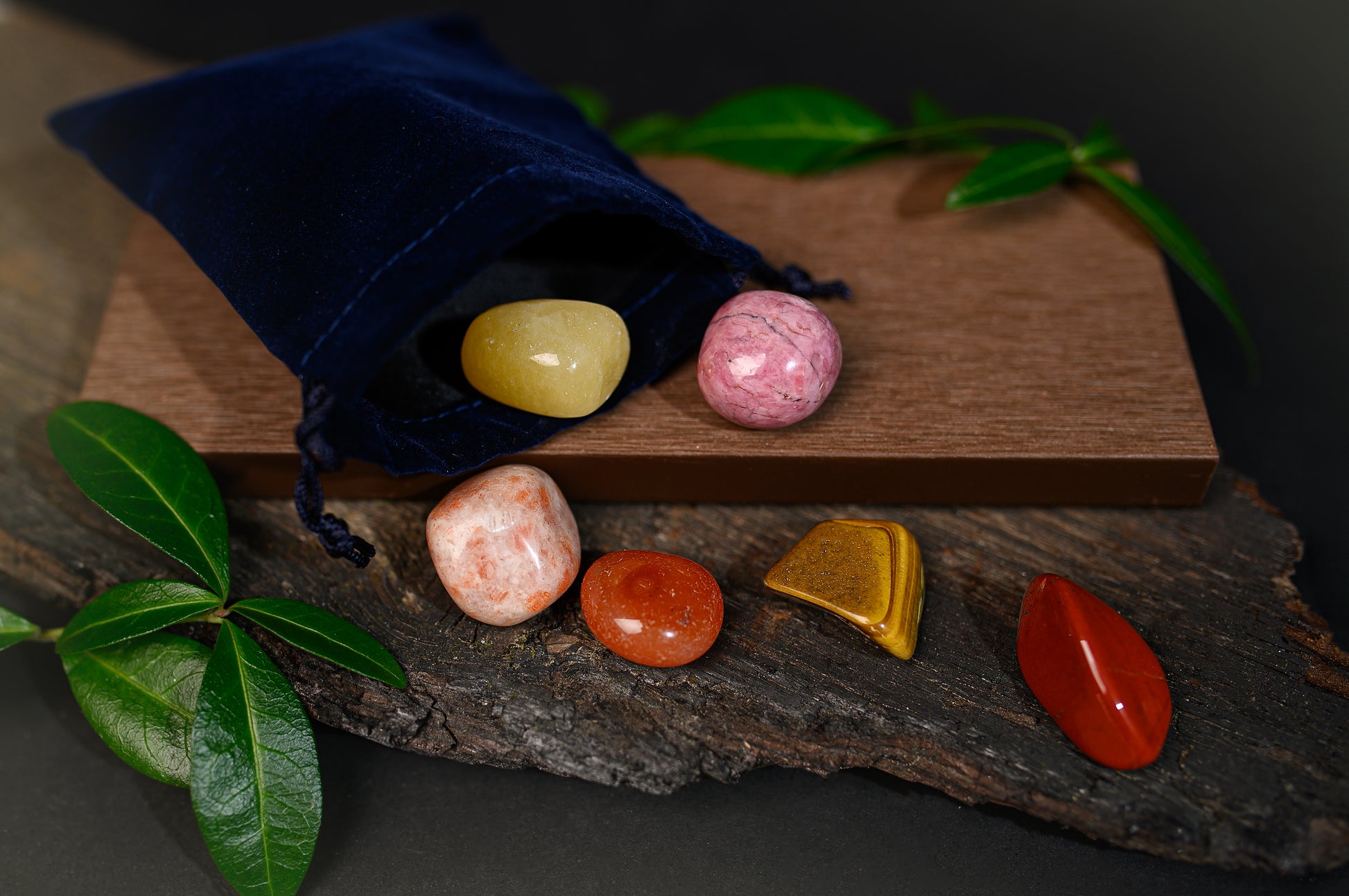 - Kiteet: Karneoli, auringonkivi, oranssi kalsiitti, tiikerinsilmä, rodoniitti, punainen jaspis
