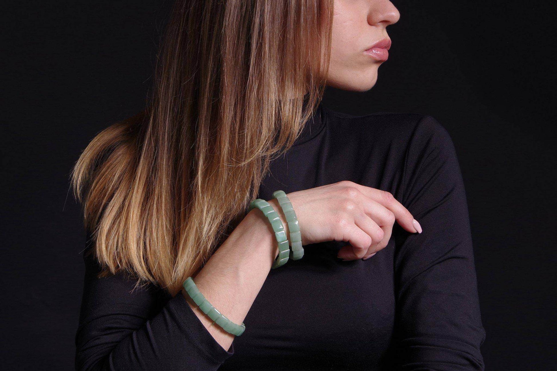 Chaque perle, à la forme précise, met en valeur la riche couleur verte de l'aventurine et ses subtils reflets. Ses bords nets et ses surfaces planes créent une esthétique moderne et épurée, qui se distingue par sa sobriété. - Énergie autonomisante :
