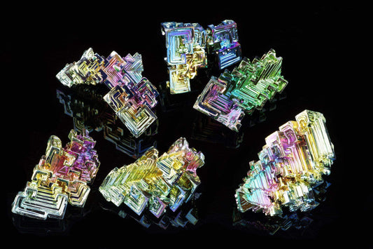 铋是一种脆性金属元素,结晶后会形成色彩斑斓的几何形状,令人联想起未来主义风格的楼梯。实验室培育的铋通常呈现出闪耀的彩虹光泽,呈现出从粉银色到蓝金色的醒目金属渐变色。除了独特的美学特征外,铋还象征着变革和结构化秩序的建设潜力。
